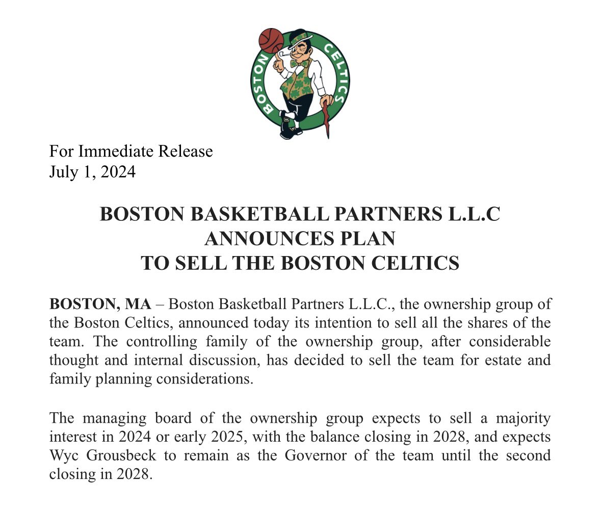凯尔特人所有权集团公司L.L.C.今日宣布,计划出售该球队的所有股份。所有权集团的控制团体经过深思熟虑和内部讨论后,出于家族财产和家族计划的考虑,决定出售这支球队。所有权集团的管理委员会预计将在2024年或2025年初出售多数股权,剩余部分在2028年前完成,预计威克-格罗斯贝克将继续担任该团队的董事,直到2028年全部出售完成。