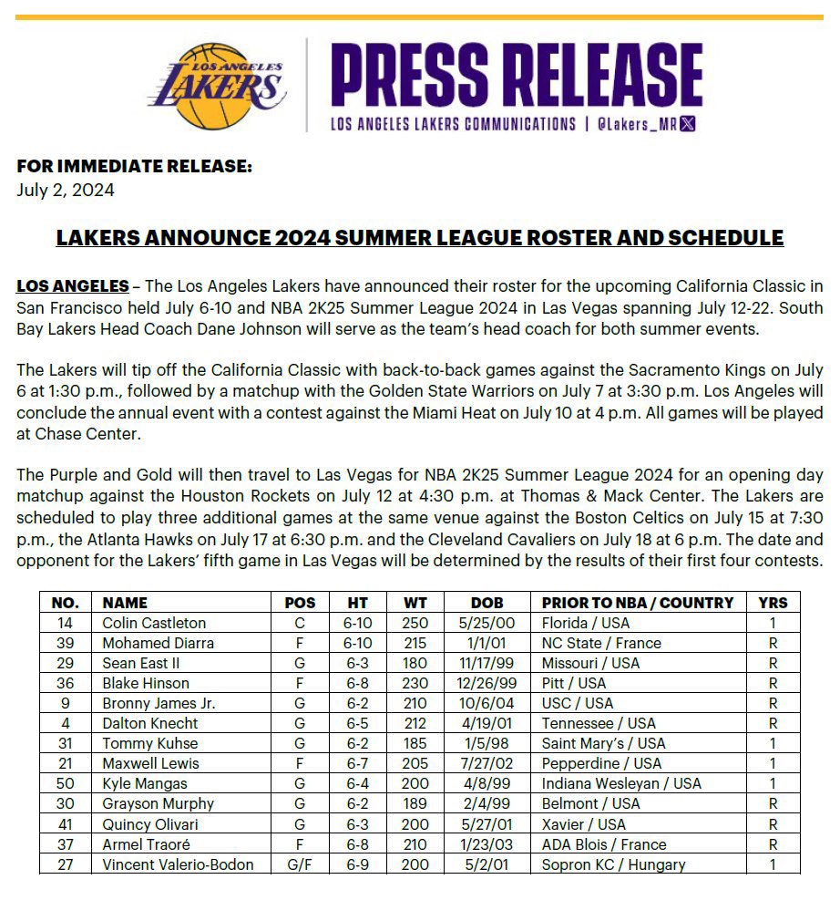 07月03日讯 湖人官方公布了加州经典赛(7月7-11号)和拉斯维加斯夏联(7月13-23日)的名单,南湾湖人的主帅戴恩-强森担任主帅。