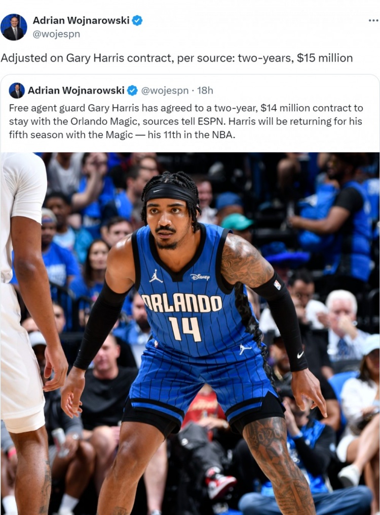 7月3日讯 昨天据名记Woj报道,消息人士透露,自由球员加里-哈里斯2年1400万回归魔术。今天,据Woj更正,加里-哈里斯的合同为2年1500万美元。