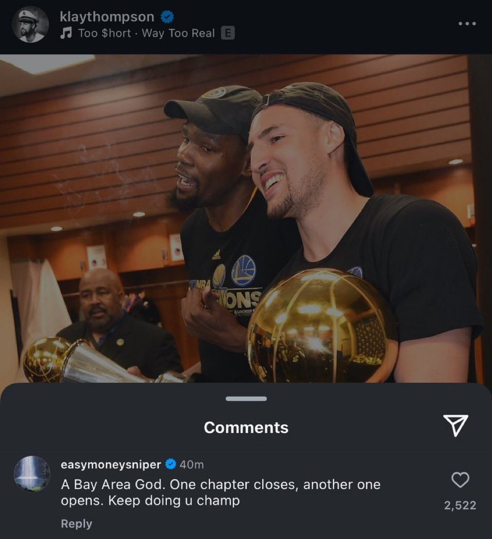 克莱在IG告别了勇士,前队友杜兰特也在两人合影的评论区留言: