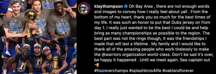 7月6日讯 今天,克莱更新社交媒体向勇士告别。