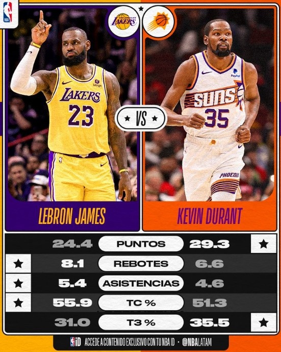 11月11日讯 NBA季中锦标赛,太阳将在主场迎战湖人。本赛季,詹姆斯和杜兰特的场均数据如上,詹姆斯场均24.4分8.1篮板5.4助攻,杜兰特场均29.3分6.6篮板4.6助攻。