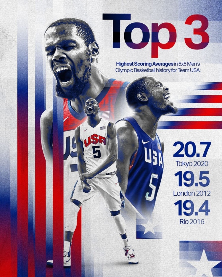 美国男篮单届奥运场均得分前三:2020年KD 2012年KD 2016年KD