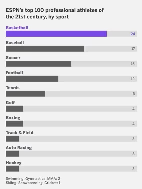 据统计,在评选出的100名运动员中,篮球运动员人数最多达到24人,棒球运动员17人排名第二,足球和橄榄球分别排名第三(15人)和第四(12人)。