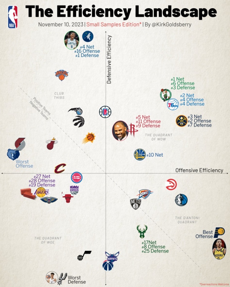 11月11日讯 今天,数据专家Kirk Goldsberry公布了截至11月10日联盟各队攻防效率象限图。