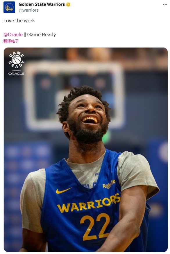 11月11日讯 勇士官推今日晒出维金斯大笑训练照,并配文:“热爱工作!”