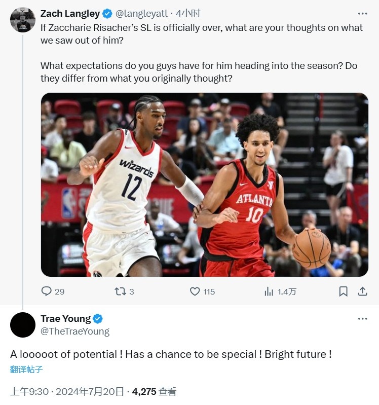 在Zach Langley这条动态下,特雷-杨评论道:“他有很大的潜力!有机会成为一名特别的球员。他拥有光明的未来。”