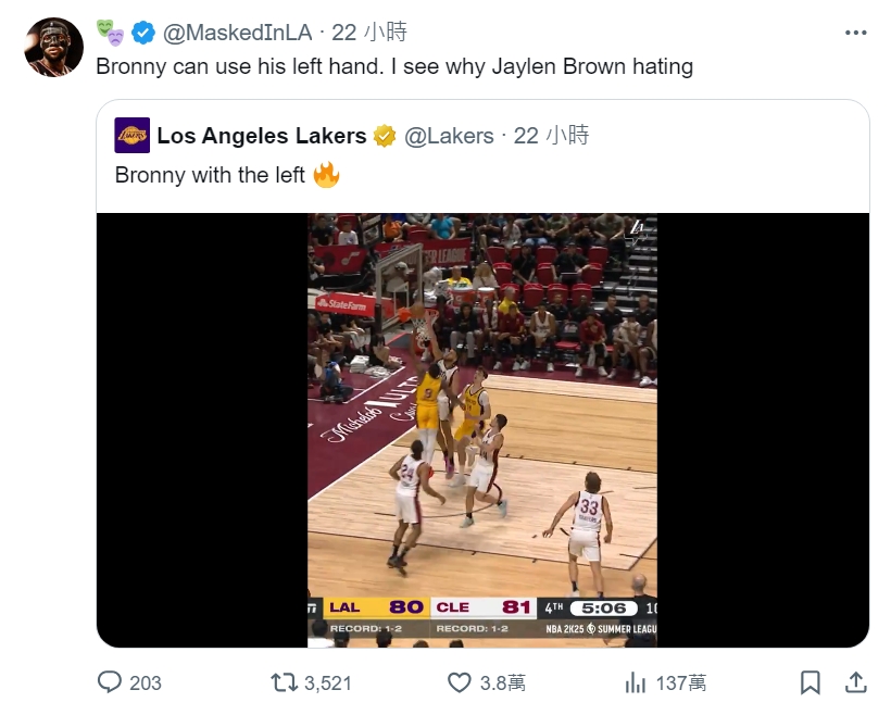 湖人自媒体:布朗尼会用左手,这就是杰伦-布朗黑他的原因。