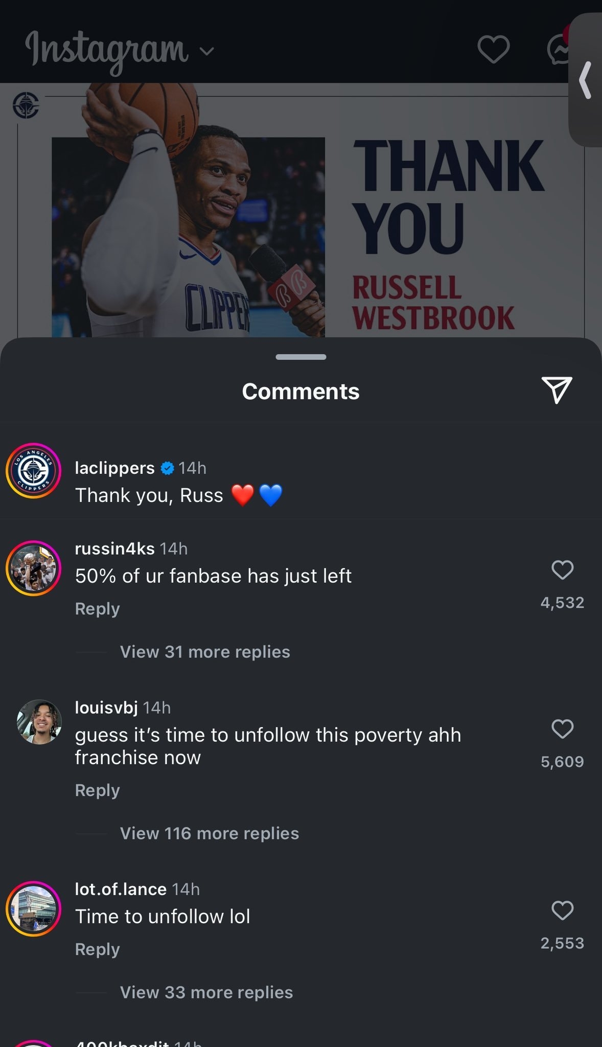 影从云集!威少交易离队后 快船官方社媒掉了140万粉丝
