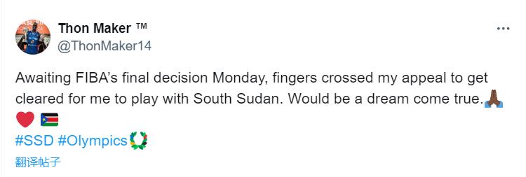 07月21日讯 据此前欧媒报道,波尔-波尔(球队决定)和索恩-梅克(FIBA没让)无法代替南苏丹出征奥运会,南苏丹则是历史首次杀入奥运。梅克今日发推表示仍在仍待国际篮