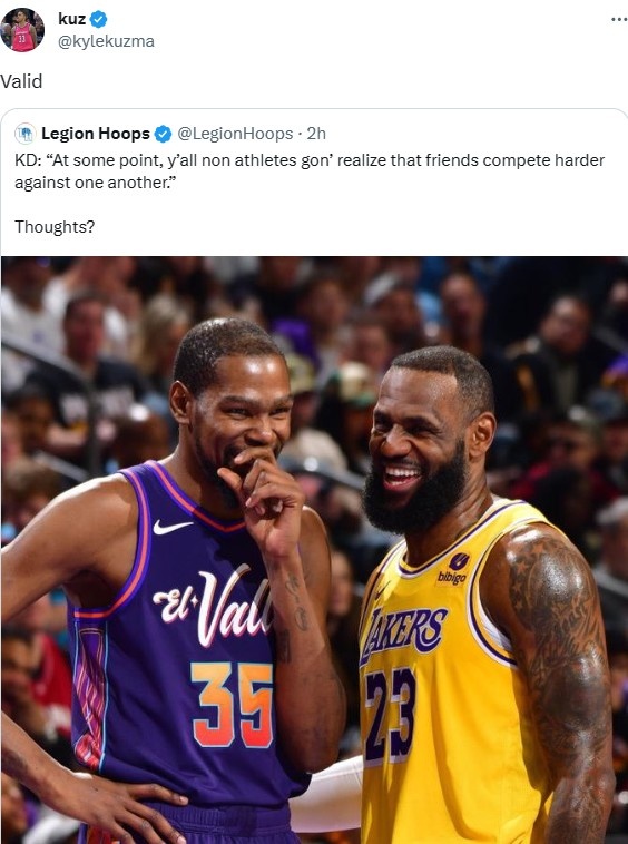 网友不满詹杜比赛中谈笑&KD称朋友间竞争更激烈!库兹马:正确