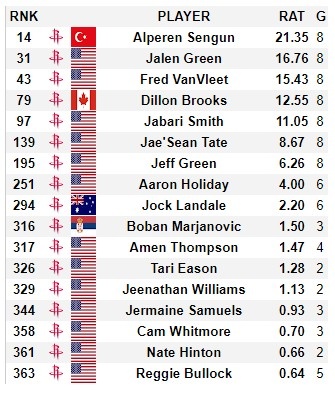 11月12日讯 火箭近期豪取五连胜,战绩来到5胜3负,排名西部第五。美媒HoopsHype晒出火箭球员的最新RAT值,申京排名联盟第14,杰伦-格林第31,范弗里特第43。火箭共