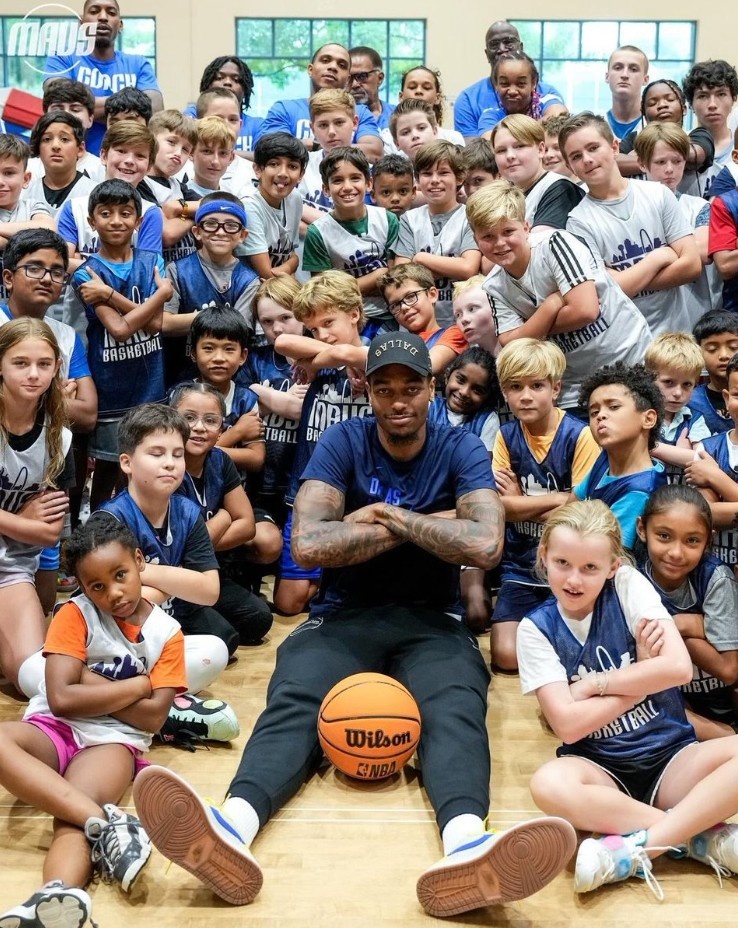 在一张合影中,PJ-华盛顿与小学员们一起摆出抱臂的动作。这一动作曾在季后赛火出圈。