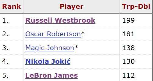 强强联合!威少199次三双位居历史榜第一 约基奇130次暂居第四