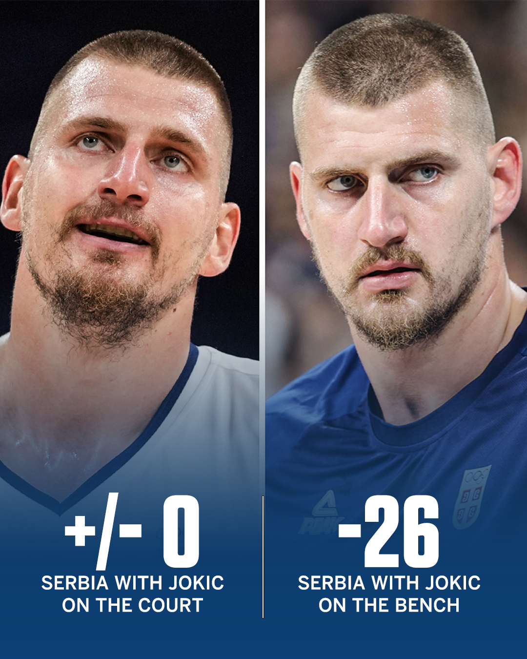 约基奇在场,塞尔维亚净胜分是0;约基奇下场休息,塞尔维亚净胜分是负26!