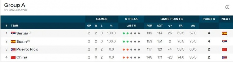 A组目前情况:塞尔维亚、西班牙确认晋级8强