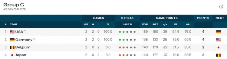 然后是情况较为简单的C组,美国队和德国队两场全胜,日本队和比利时队两战皆败,最后一场日本队要和比利时队争夺第三。美德两队在比赛场上毫无美德,所以目前比利时队-27,日本队-37,俩队暂时净胜分都比中国队少,简单来说,比利时队要赢日本队,还得比中国队赢波多黎各队要多4分以上(中国队总得分目前比比利时队还多得5分,比完净胜分要比总得分);日本队更难整了,要赢比利时队的分差,得比中国队赢波多黎各队多14分以上。
