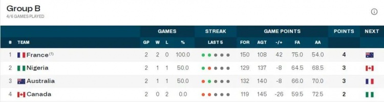 法国队目前两场全胜且净胜42分,提前出线并且极大概率锁定小组第一;尼日利亚队和澳大利亚队都是一胜一负净胜分-8分;加拿大队两场全败-26分暂列第四。