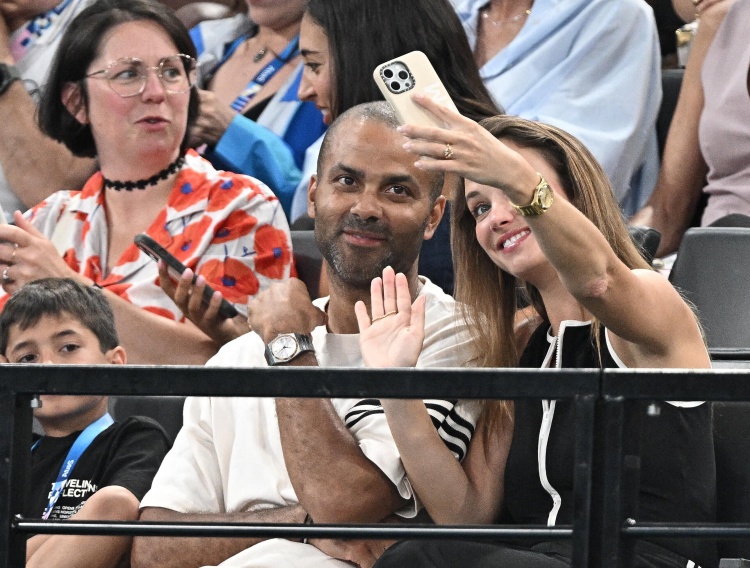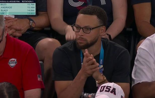 詹娜与男闺蜜、库里、帕克、齐达内观战女子体操全能决赛