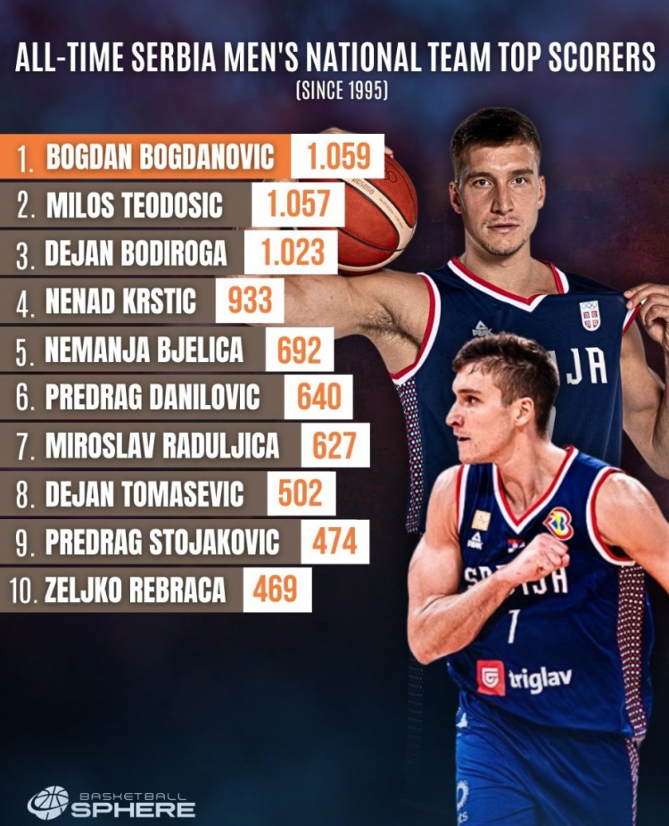 凭借这57分,博格丹已经成为了塞尔维亚男篮史上(1995年有统计以来)的历史得分王,他共得到1059分。