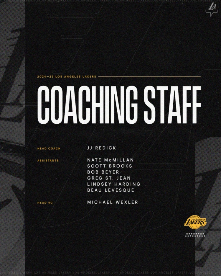 湖人官宣24-25赛季教练团队:雷迪克任主帅 助理教练共有6人