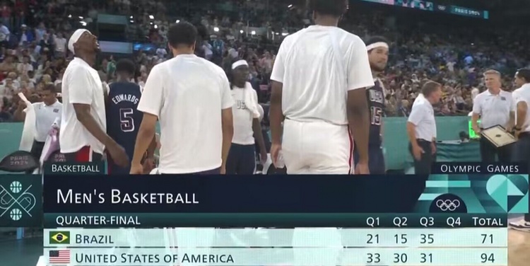 8月7日讯 奥运男篮1/4决赛下半区,美国男篮三节打完94-71领先巴西。