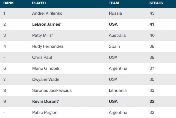 据统计,詹姆斯在奥运会上一共有41次抢断,可排历史第二。排名第一的是俄罗斯球员基里连科,他共有43次抢断: