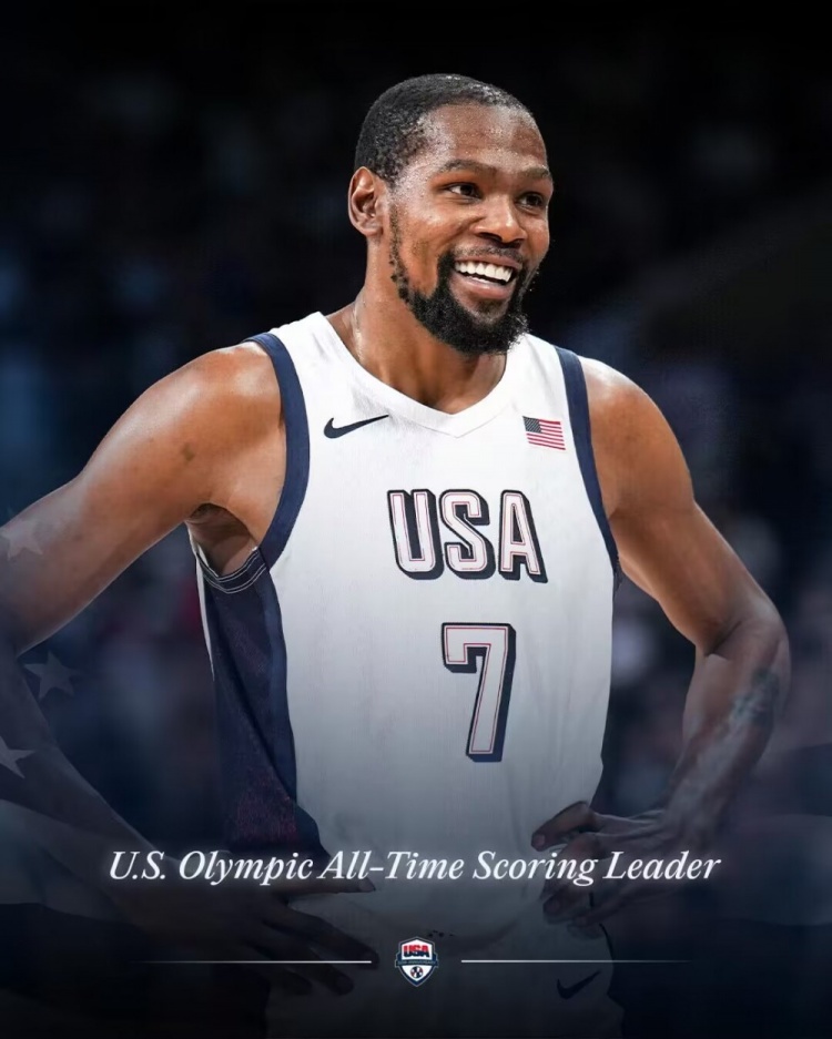 里程碑!杜兰特累计得到494分成为美国篮球奥运会历史得分王