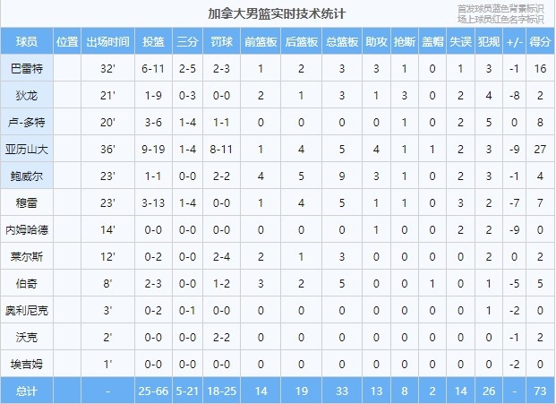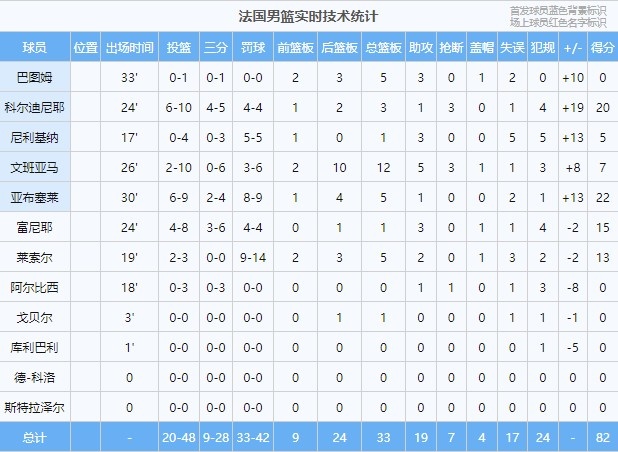 差距悬殊!法国42罚33中&莱索尔14罚9中 加拿大全队25罚18中