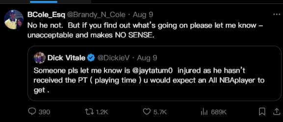 ESPN分析师Dick Vitale发推写道:“有人可以告诉我塔图姆是不是受伤了吗?他一分钟上场时间都没得到,大家希望看到所有的NBA球员都有上场时间。”