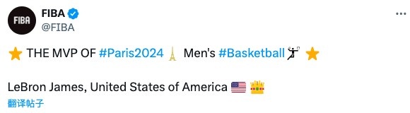 赛后国际篮联官方宣布,詹姆斯荣膺本届奥运会男篮MVP。