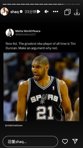 11月14日讯 此前,前NBA球员阿泰斯特曾更推道:“新列表。NBA有史以来最伟大的球员是邓肯。来反驳一下他为什么不是。”今日NBA名宿奥尼尔在INS上转发了该动态
