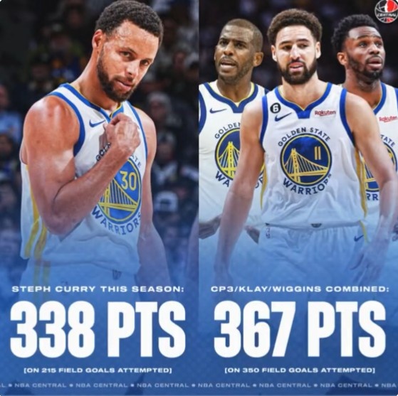 新赛季至今,库里出手215次得到338分,克莱、维金斯、保罗合计出手350次,一共得到367分