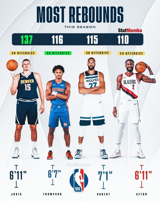 本季至今约基奇抢下137个篮板联盟第一 奥萨尔-汤普森116个第二