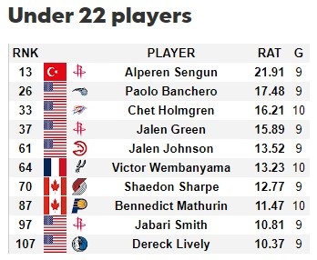 11月15日讯 美媒HoopsHype今日晒出新赛季至今,联盟22岁以下球员RAT值排名,申京排名第一(总排名第13),班凯罗、切特、杰伦-格林分居2-4位,文班亚马排名第6。