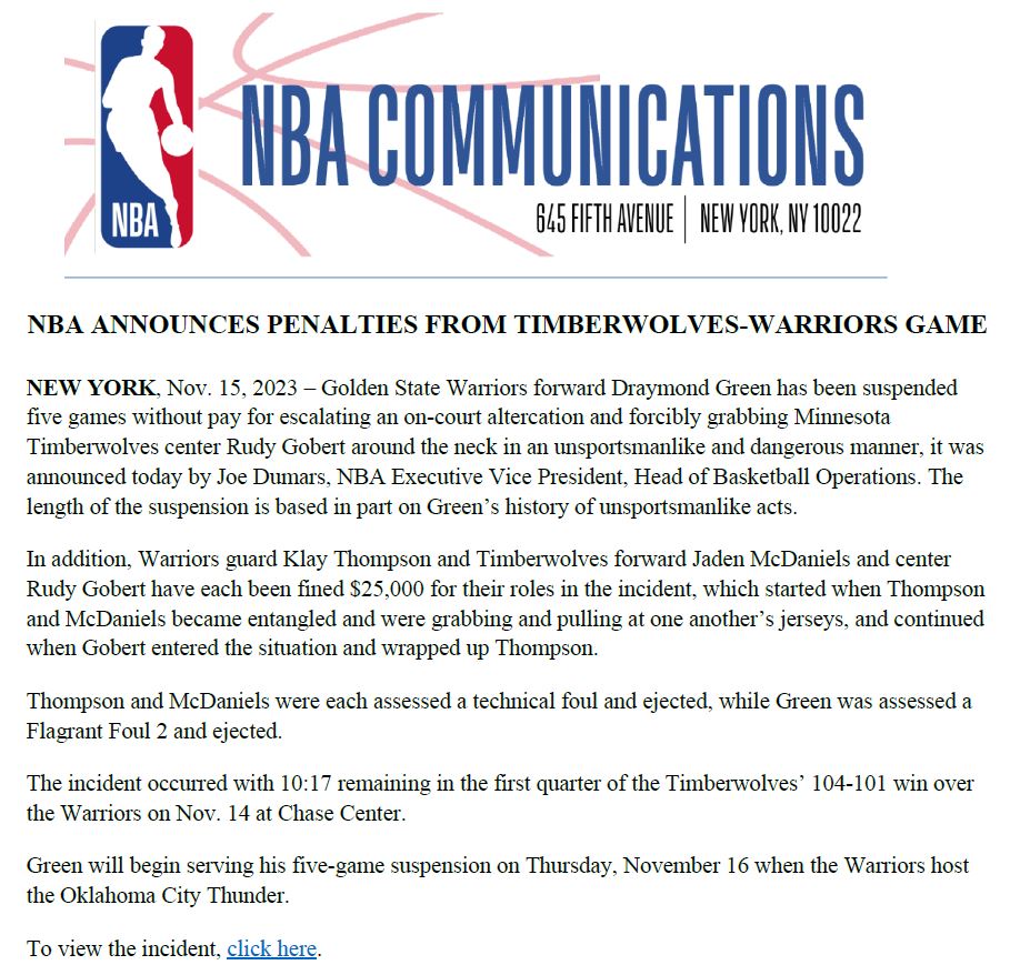 11月16日讯 NBA官方宣布,追梦因锁喉戈贝尔被禁赛五场,麦克丹尼尔斯、克莱和戈贝尔被罚款25000美元。