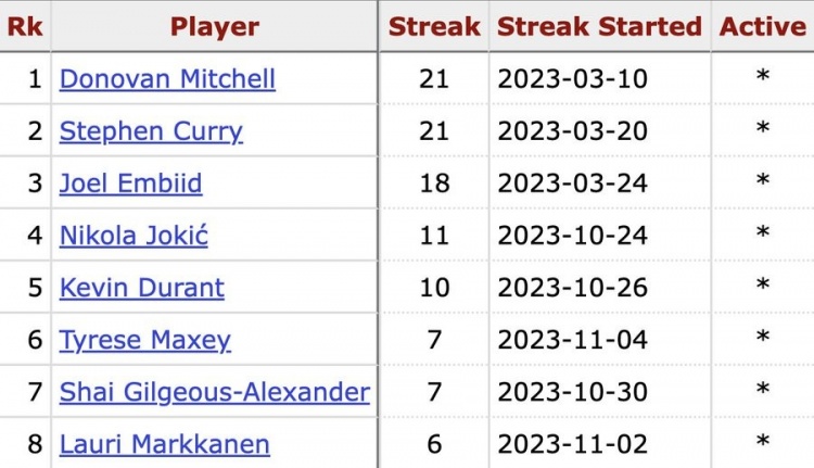 现存连续得分20+场次:库里与米切尔21场居首 大帝约基奇分列二三