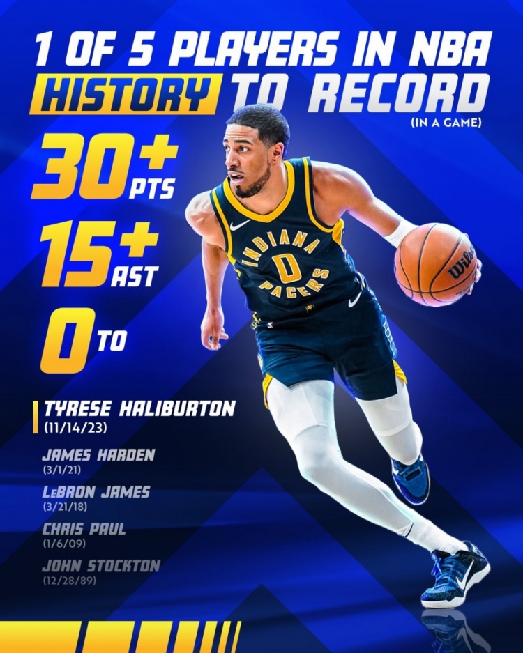 据步行者官方统计,哈利伯顿单场至少30分15助且0失误,史上第5人,前4人分别是哈登、詹姆斯、保罗、斯托克顿。