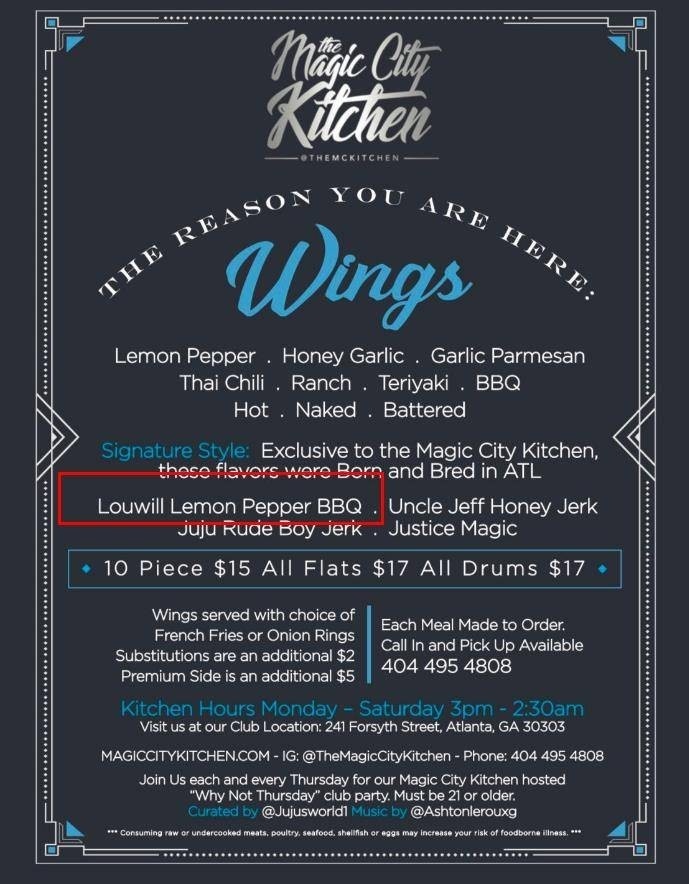 Magic City Kitchen随后晒出自家的菜单,其中有一款口味的鸡翅是以路威命名的“路威柠檬胡椒烤翅”。