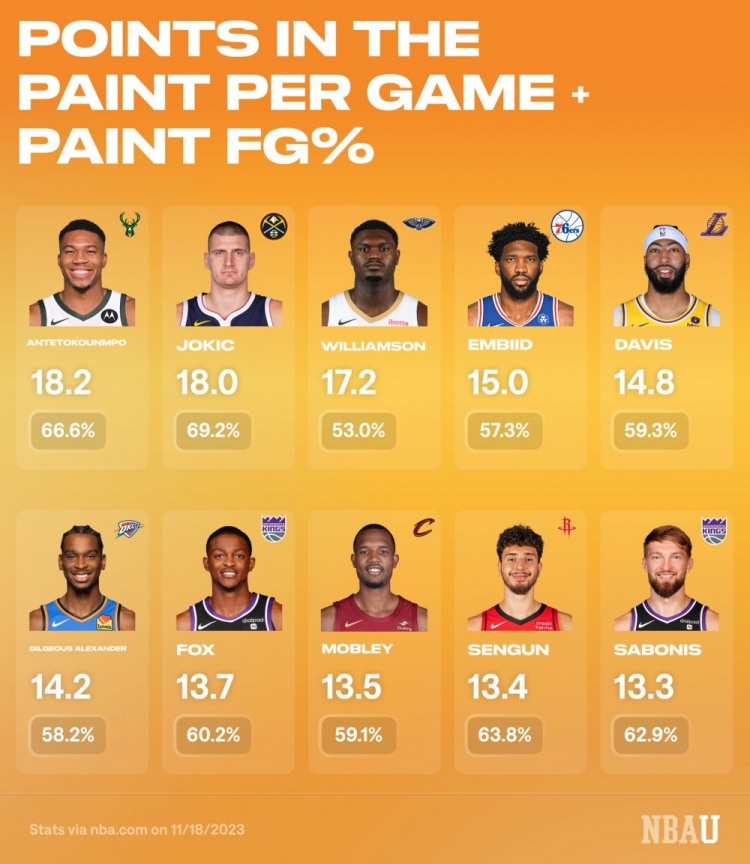 赛季至今场均内线得分排名:字母哥18.2分居首 约基奇次席