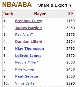 随后,哈登也超越雷·阿伦,排名历史第二。
