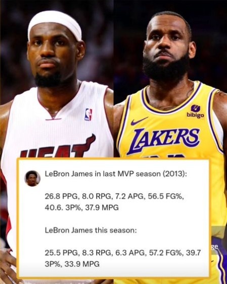 老詹本季与上次MVP赛季数据对比:场均得分助攻略低 篮板更多