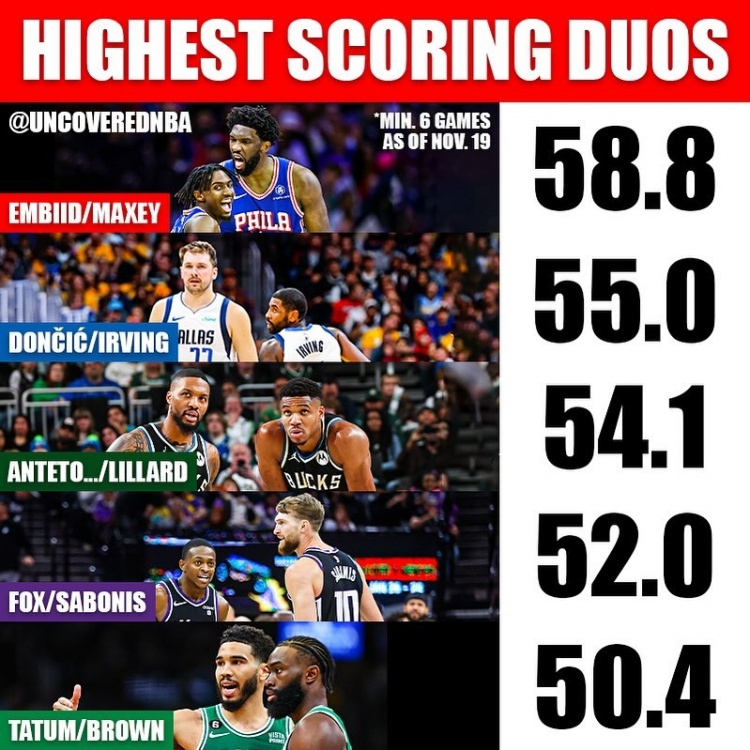 本季至今场均得分最高双人组:西帝组合58.8分居首 东欧55分居次