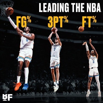 雷霆本赛季三项命中率50.3/41/86.7% 均为联盟第一!