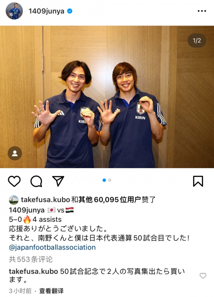 久保建英、菅原由势、谷口彰悟、巴洛贡等都在这条社媒点赞,久保建英评论区打趣道:“如果你俩出了国家队50场纪念写真集,我一定会买。”
