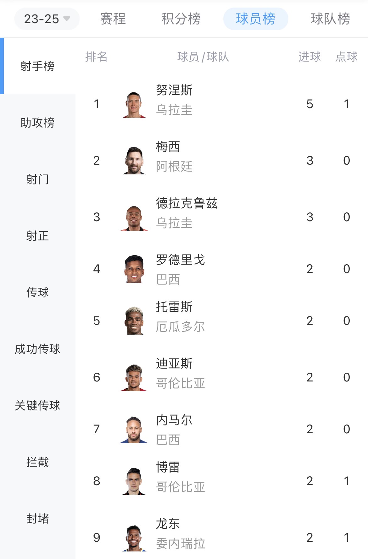 本场过后,努涅斯以5球领跑南美世预赛射手榜,梅西、德拉克鲁兹三球并列第二。