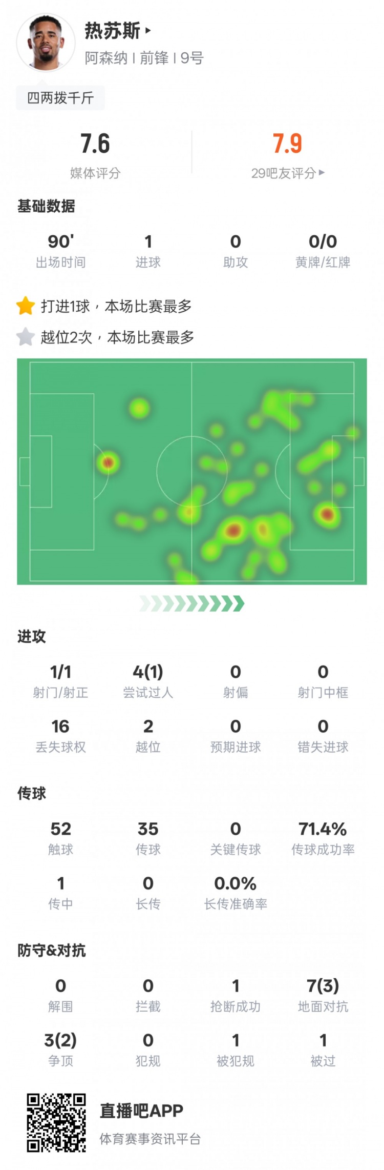热苏斯本场数据:1进球1过人成功+16次丢失球权,评分7.6
