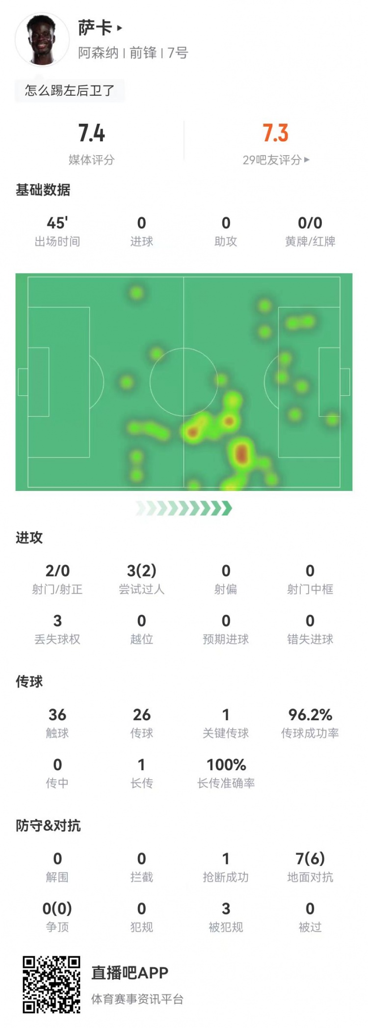 - 萨卡半场被换下:2射0正+3造犯规 7对抗6成功 获评7.4分
