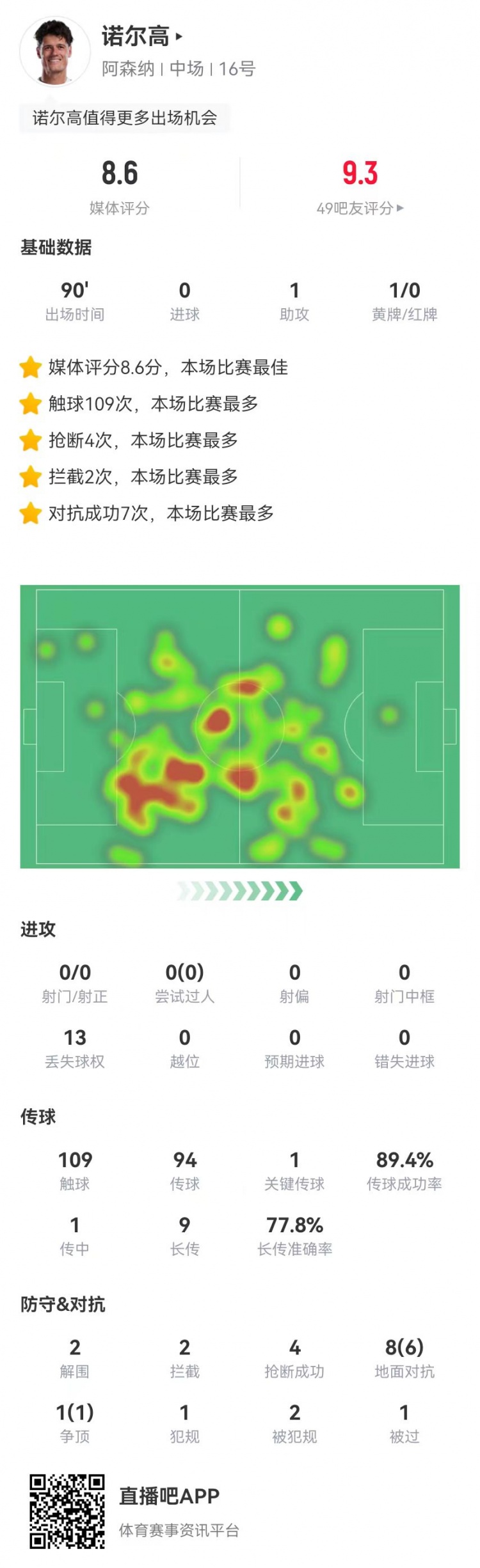 - 诺尔高本场1助攻+9长传7成功 2造犯规2解围2拦截4抢断 获评8.6分