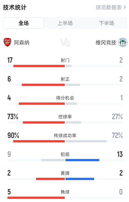 - 阿森纳4-0维冈竞技全场数据:射门17-2,射正6-2,控球率73%-27%